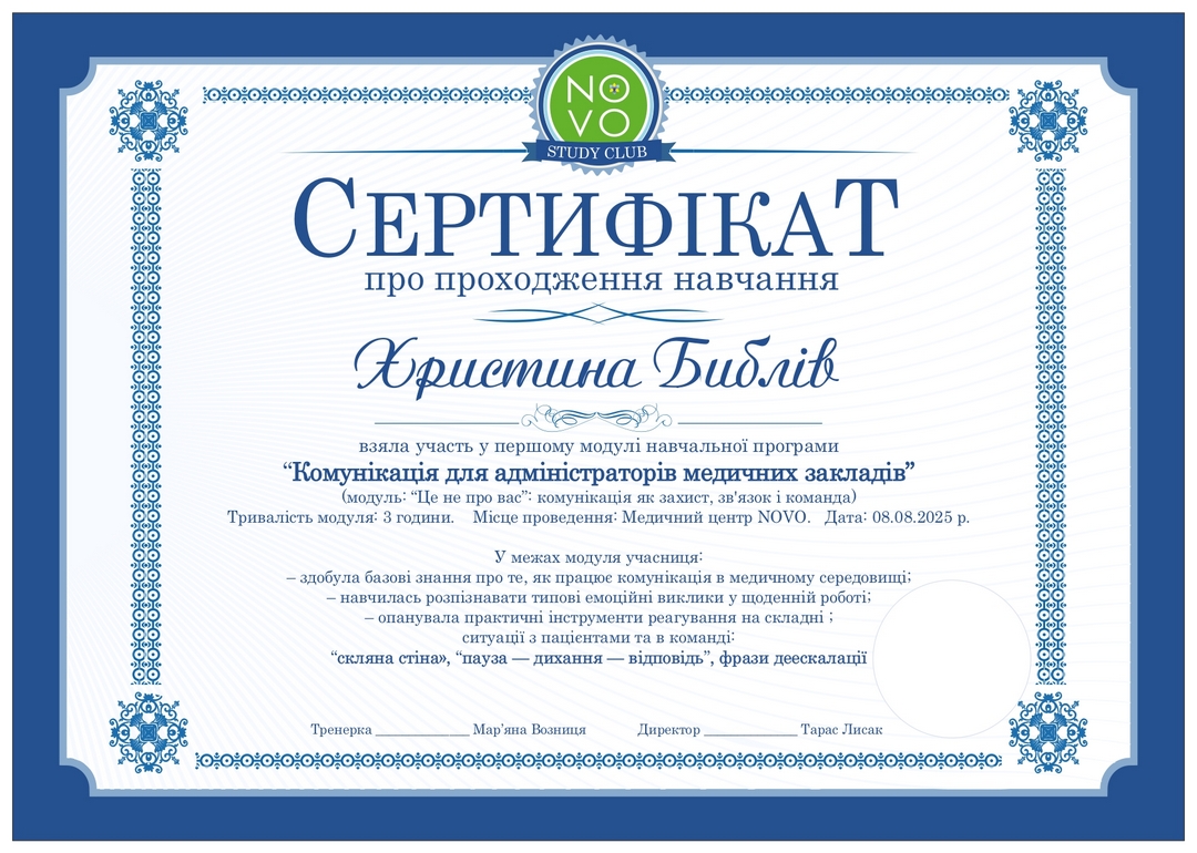 Щиро вдячна персоналу та лікарям клініки NOVO за високу професійність, уважність, чуйність і такт. Вже не вперше звертаємося до цієї клініки. Мали змогу порівняти із сервісом інших медцентрів у Львові. Вирішили більше не експериментувати, тому знову звернулися до перевірених і надійних. Особливо великий уклін і вдячність за терплячість і вихованість персоналу, адже була свідком досить складних ситуацій з психологічно нестабільними пацієнтами, які проходять медобстеження та консультування у NOVO. І персонал та лікарі дуже спокійно, професійно і швидко вирішили конфліктні ситуації. Стресостійкість у команди - на дуже високому рівні! Дякую, що ви є!!!