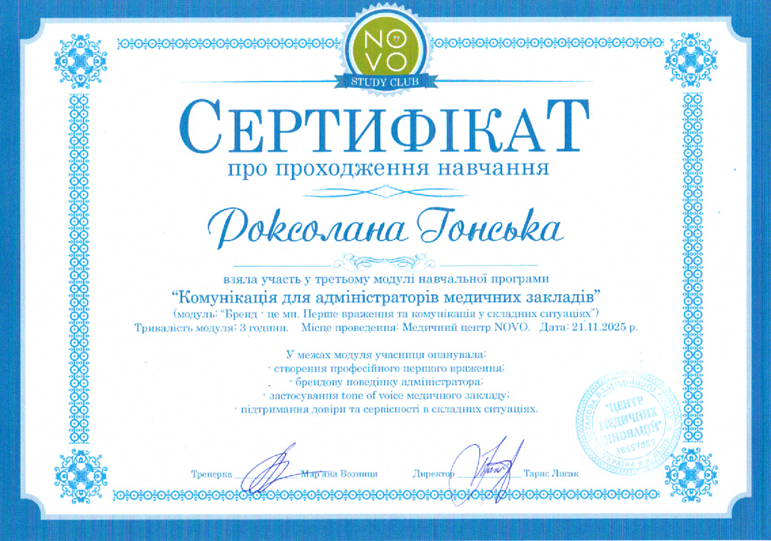 Була дуже приємно вражена вже з першої хвилини, лікарі дуже чуйні, з гарним настроєм, все детально розповідають, приємна атмосфера, в якій ти легко розлабляєшся. Також хочу відмітити, що після процедури все гарно та детально розповіли, не поспіхом, а доступно і грамотно.